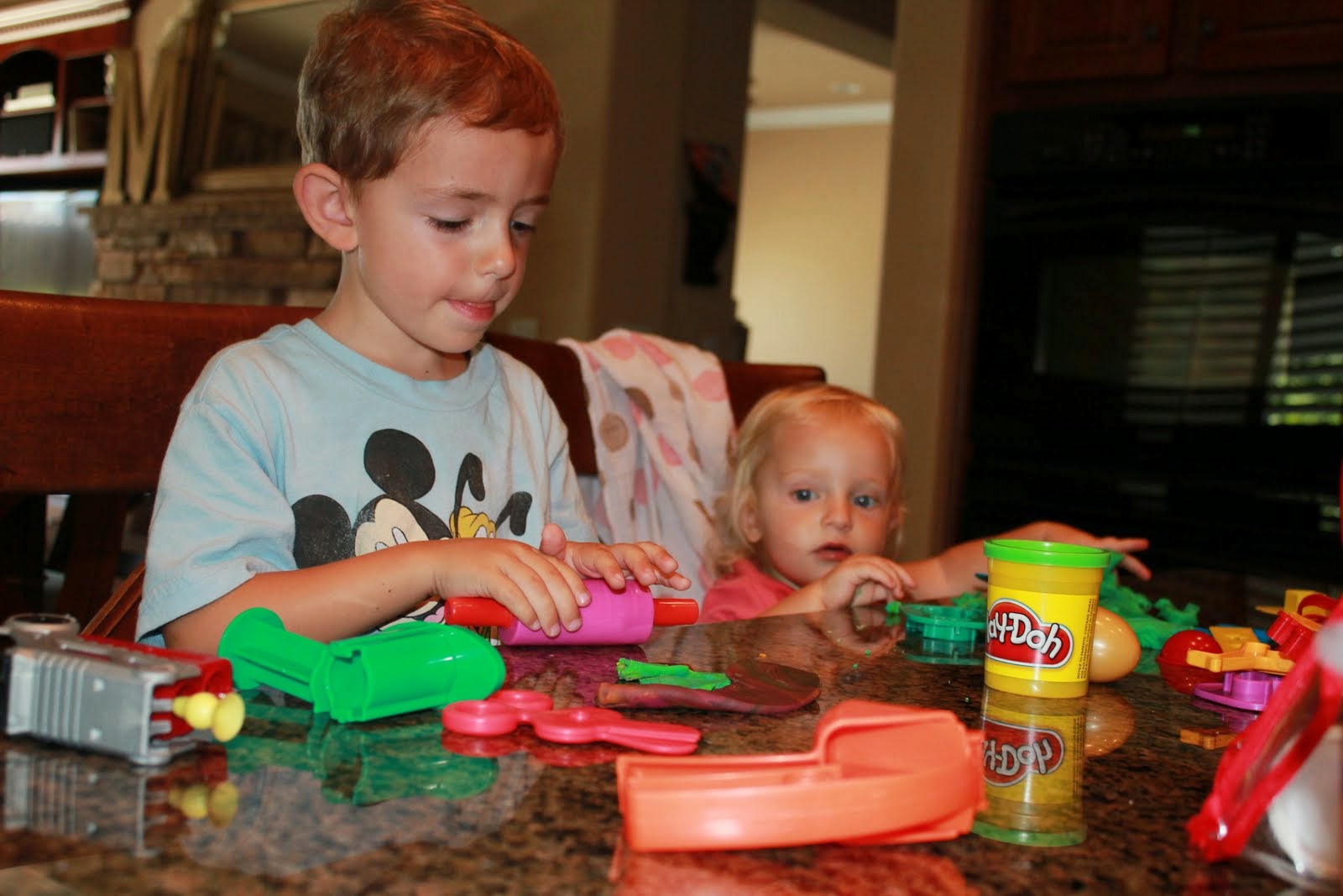 Since being pregnant, my energy level has been down. I haven't been my typical self and don't feel like doing much. This week was especially bad because Caitlin had the flu for 4 days and wasn't keeping anything down. So when today rolled around, I was done. In thinking of ways to occupy two kids who's interests vary, I decided to try Play Dough which is a favorite for Carson but Caitlin normally just wants to eat it!