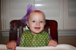 Can it really be one more month until Cait's first birthday?! She is getting more vocal and although she doesn't speak we usually know what she wants. She still enjoys crawling everywhere and will crawl real fast so she isn't left out because she doesn't want to miss a second. She has started to relax a little and will sit still long enough to finish a couple of books if I read fast. Loves to eat and so far hasn't been picky. Great sleeper and pretty happy too with random dramatic spells it seems daily-hey she is a girl after all! We love our sweat pea!