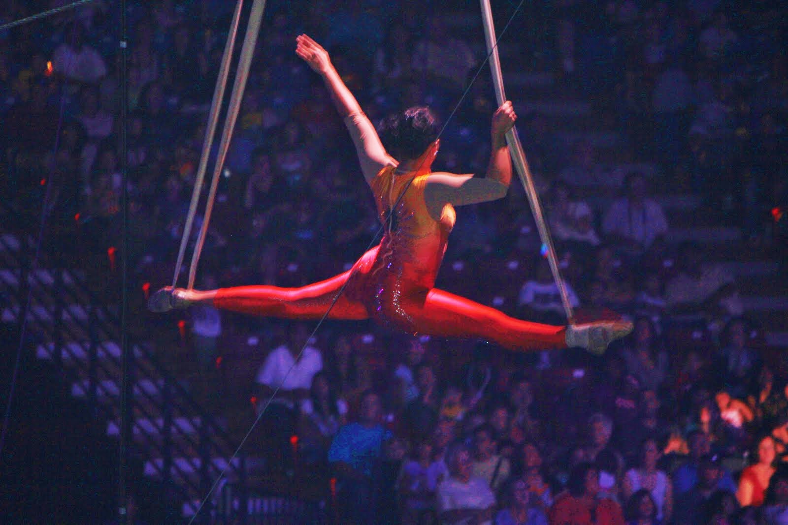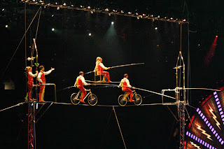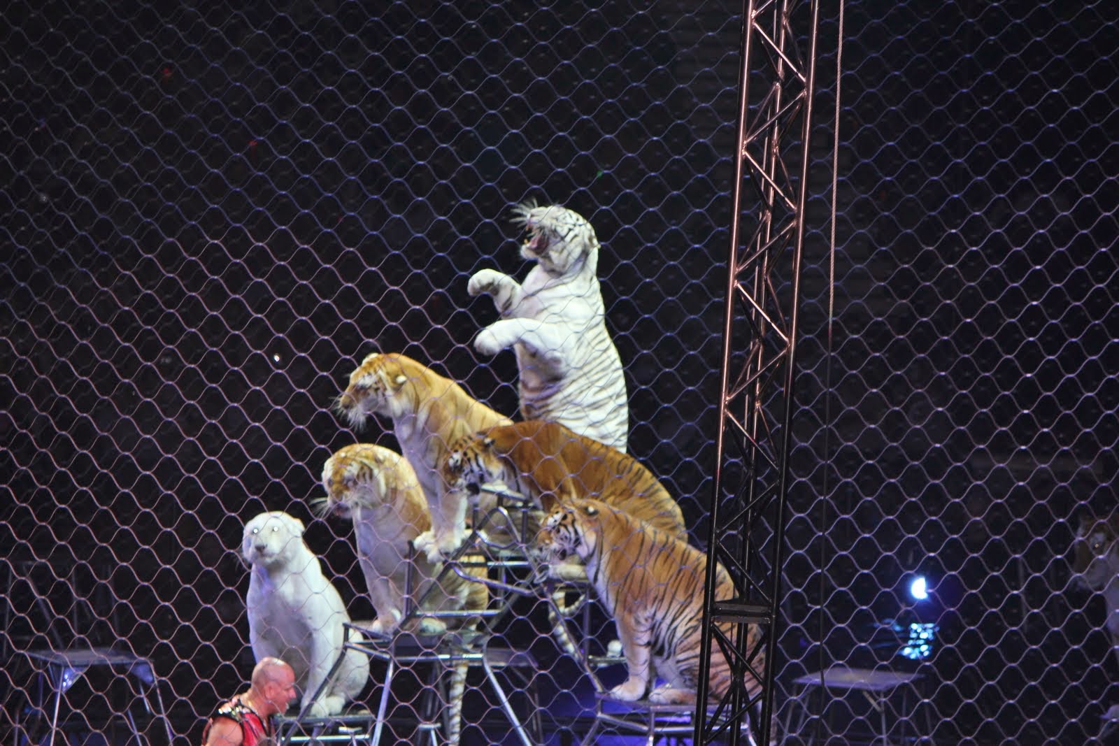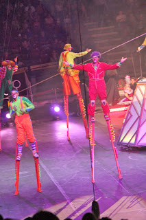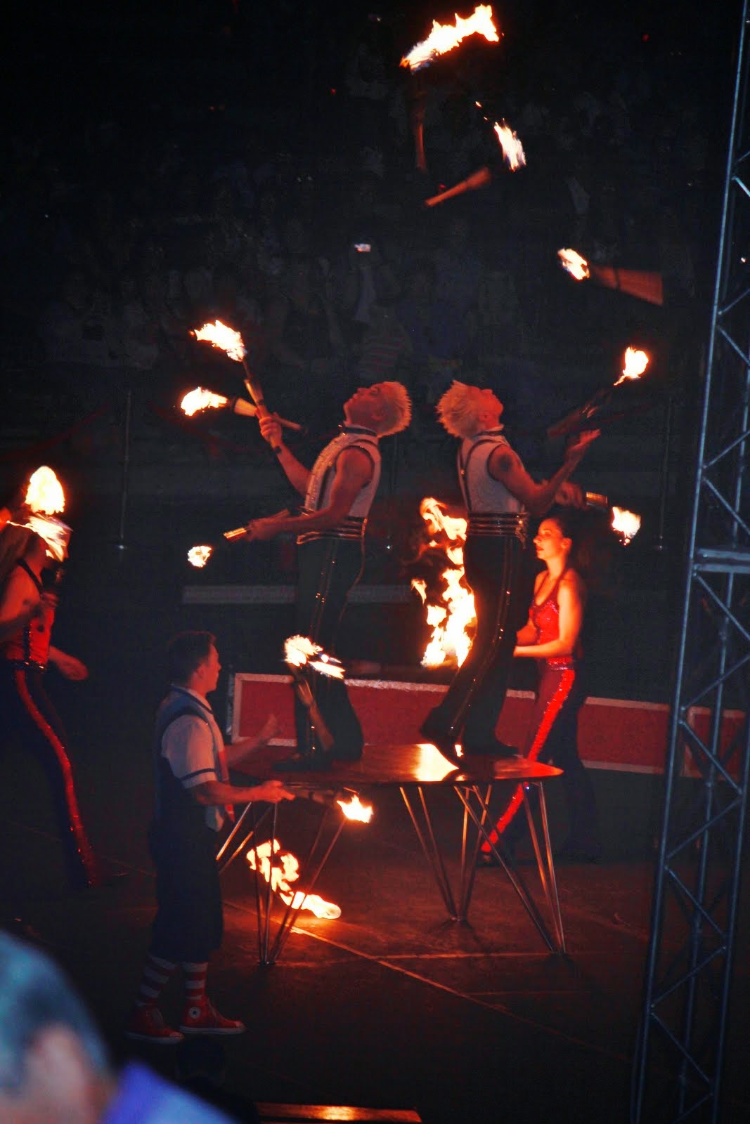 There was plenty to look at; clowns, elephants, jugglers, "tall" guys, gymnasts, tigers, trapeze artists, horses, zebras, strong men, and a crazy guy that was catapulted from a cannon across the court literally on FIRE!